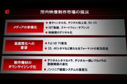 「デジタルシネマ対応映画館は増加している。CM制作分野は、制作費減少によるダウンサイジングが機材のデジタル化を推し進めている。ここが『Cinema EOS』シリーズのメインターゲットとするところだ。現在映像編集作業はほぼデジタル化しており、今後は映像撮影分野でも、デジタルシネマカメラが急速に普及していくと見ている。『EOS 5D Mark II』の動画撮影機能はプロの方々から高い評価をいただき、CMやPV、短編映画などの撮影にも使っていただいている。しかし、使い勝手という点では改善点があり、期待に沿いきれなかった部分もあったと思う。その点『Cinema EOS』シリーズは動画撮影に特化することで優れた操作性を実現しており、きっとご満足いただけるものと思う」(川崎氏)。