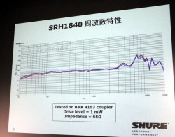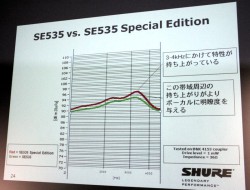 音質については、1年程前に日本に来た際、日本のリスナーには高域の鮮明さがもっと必要だと指摘されたことを受け、改良を行ったことを紹介。SE535との周波数帯域の比較グラフも見せ、「SE535に比べ3〜4kHz付近の特性が持ち上がっている。この帯域周辺が持ち上がったことでボーカルにより明瞭感が加わった」と、具体的な音質向上のポイントについても言及した。