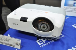 文教現場での使用をターゲットにした壁掛け型の超単焦点モデルは電子黒板機能を一体化した「EB-485WT」「EB-480T」が新たに加わる。上位機の485WTは解像度がWXGA、明るさが3100ルーメン。内蔵スピーカーの出力は16W。最短18.7cmの投写距離で80型の画面サイズを実現し、天井の低い場所での設置にも対応する。通常のプロジェクターと同様、デスクトップへの設置やテーブルへの画面投写にも対応し、レイアウトの自由度も高めた。