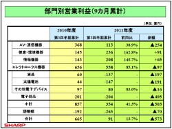 部門別内訳は、AV・通信分野が国内液晶テレビの収益悪化により254億円の減益。液晶は、第1四半期前半で大型液晶パネル工場の稼働を停止したこと、亀山第2工場の操業率を低下させたこと、堺工場の外販減少などが重なったほか、大型液晶パネルの在庫評価減を行ったことにより、197億円の減益となった。