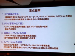 まずひとつめが「コア事業の強化」。デジタルイメージング事業とゲーム事業という、同社が持つ2つの領域での垂直統合型ビジネスにおけるナンバーワンポジションを確立し、確実に利益を創出すること、それらのビジネスで培った資源を最大限に活用することで、今後特に成長が見込まれるモバイル事業の強化を図るとした。