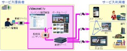 同社が2006年から提供中のネットテレビ向け映像配信サーバシステム「Videonet.tv」の機能を拡張。新たにスマートフォンやPCを対象に追加し、これらに向けた動画・画像のオンデマンド配信、スマートフォン、TV、PCの種類に応じたポータルぺージの自動生成、ブックマークやポータルページの共有による視聴連携等の機能を拡充した。