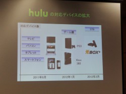 映像配信サービス「Hulu」が利用可能な点も本機の大きな特徴だ。Huluでは2011年9月1日以来、日本国内においても月額1,480円定額という料金プランにてマルチデバイス対応のオンライン映像配信サービスを展開している。2012年3月21日時点ではPC、スマートフォン、タブレット、パナソニックやソニーの対応するテレビ製品で利用することできたが、「光BOX+」の登場により、インターネット接続環境とHDMI端子を搭載するテレビがあれば幅広くHuluのサービスが楽しめるようになる。なお、月額1,480円定額という料金体系は他のデバイスでの利用時と同じになる。