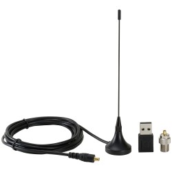 2mのアンテナケーブルを採用し、受信感度を高めている。また変換アダプタを使用して、同軸ケーブルの接続も可能。