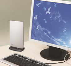 高さ約20cm、横幅約10cmを実現した手の平サイズの本体が特徴的なモデル。「薄型テレビと調和」とコンセプトに開発されたとのことで、薄型テレビやPCの横にすっきりと設置できるように配慮している。さらに、アンテナ本体は縦向きにも横向きにも設置可能で、水平・垂直いずれの偏波にも対応する。