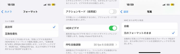 撮影動画の転送については、iPhoneのデフォルト設定では互換性を優先してSDRに自動変換してから転送するモードになっているが、「設定」→「写真」内の「MACまたはPCに転送」項目内の「元のフォーマットのまま」にチェックを入れることで、ドルビービジョンの情報を保ったまま、他デバイスに動画を転送することが可能となる。