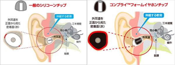 その一方で既存モデルの特長も継承。独自の低反発ポリウレタンフォームはシリコンの30倍柔らかく、体温によってさらに柔軟になるため、人それぞれ異なる耳穴の形状にフィット。口の開け閉めにともない耳穴の大きさが変化してもぴったり追従するという。また吸水速乾性も高く、外耳道炎のリスクも抑えられるほか、先端にはホコリや汗などの侵入からイヤホンを保護する「テックディフェンダー」を装着する。