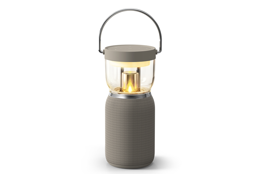 独自のアルゴリズムを用いた繊細でやさしいキャンドルのようなLED灯、360度に広がるサウンド、スッキリと洗練されたデザインにより、心地よい空間を演出するというLEDランタン。バッテリー内蔵でIPX4等級の防水性も備えており、屋外に持ち出して使用することも可能だとしている。