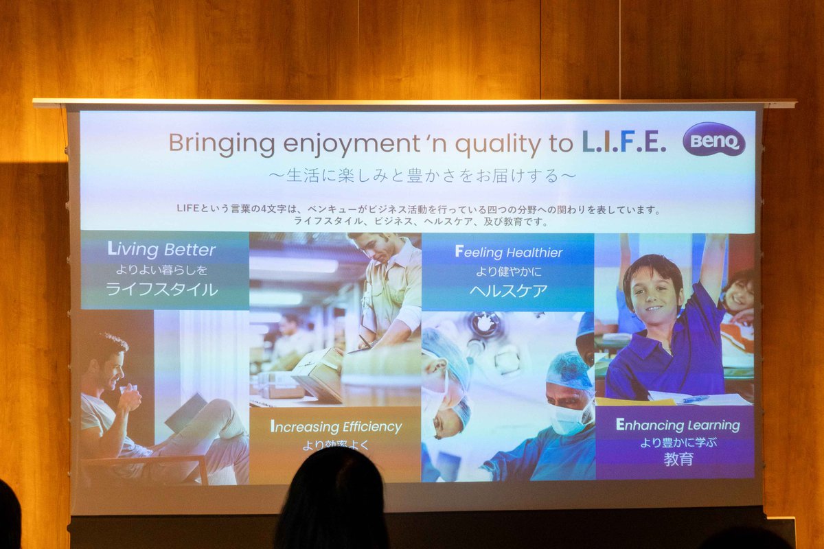 同社は創立23年の台湾メーカー。モニターやプロジェクターといった映像機器を取り扱っており、「Bringing Enjoyment ‘N’ Quality to L.I.F.E.」というコンセプトの基、「Living better」「Increasing Efficiency」「Feeling Healthier」「Enhancing Learning」を、より豊かにする提案を続けていくことを基本理念としていると明かした。