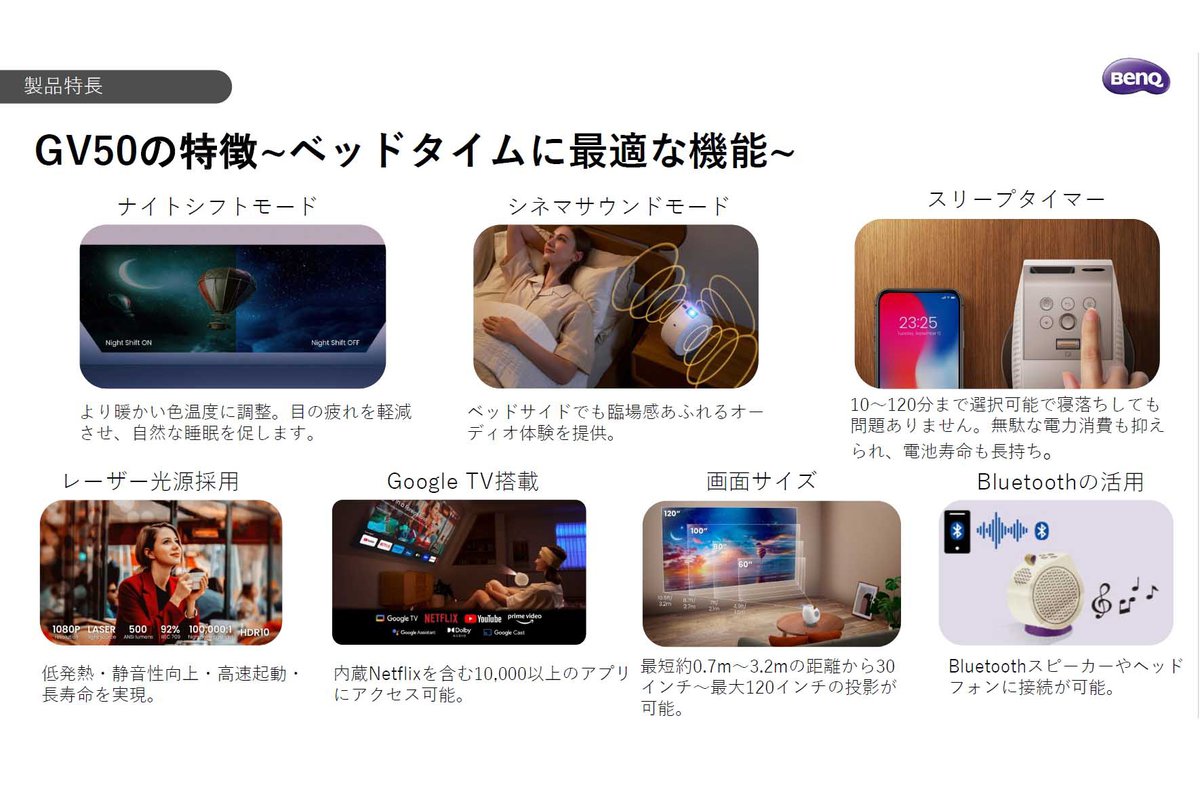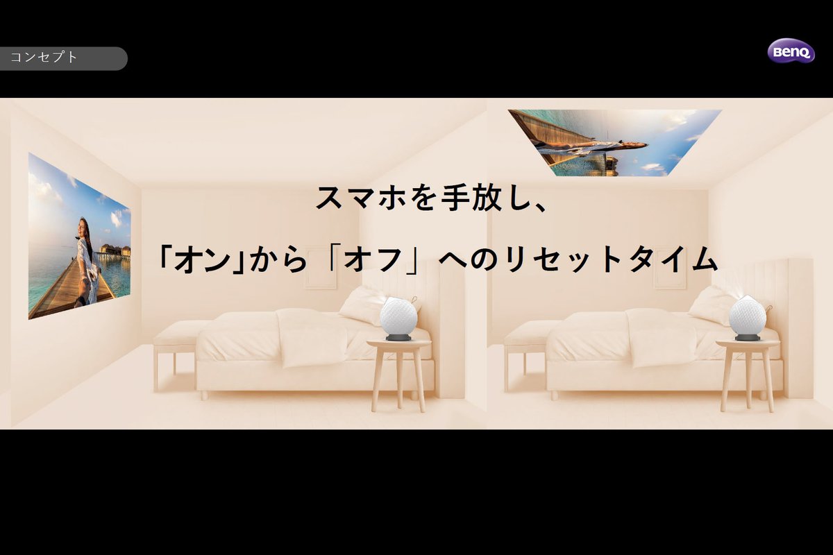 “スマホを手放し、「オン」から「オフ」へのリセットタイム”というコンセプトを持った「天井モバイルプロジェクター GV50」。ベッドタイムに入る前、スマートフォンでSNSを見たり、ネットサーフィンをする方が多い中、「スマホ疲れ」を感じている人が多数存在するとのこと。そんな「スマホ疲れ」を感じた時、スマートフォンを手放し、プロジェクターで映像を観ながら夫婦時間や一人時間を楽しむ、また子供の寝かしつけなどにも役立つアイテムだと紹介する。