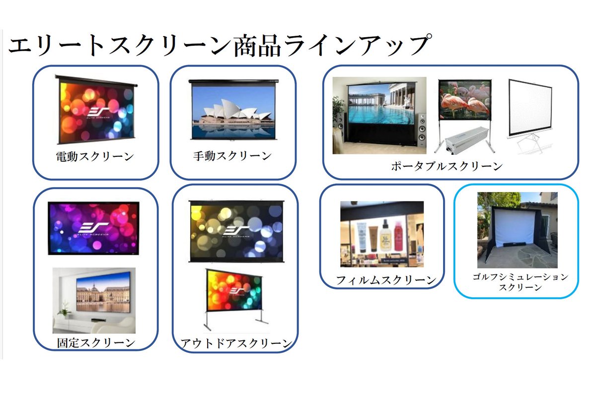 プロジェクター用スクリーンは、本体のケース部分と幕面の生地の両方が必要だが、エリートスクリーンはケースの機構から幕面の素材まで自社で開発。スクリーンタイプは、電動スクリーンや手動スクリーンをはじめ、パネルを使用した固定スクリーン、持ち運びしやすいポータブルスクリーンやアウトドアスクリーン、そしてビジネス用途でも使用されるフィルムスクリーンやゴルフシミュレータースクリーンなどをラインナップする。