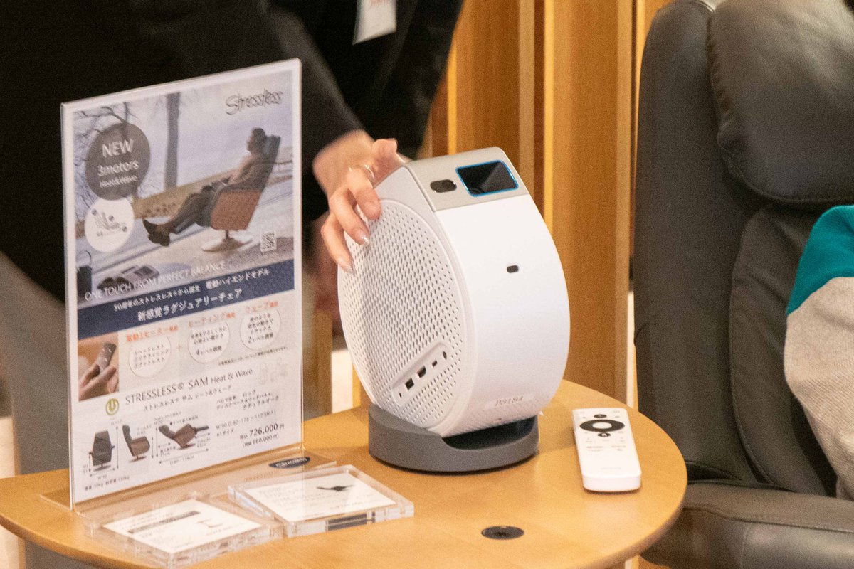 「二人暮らしのシアターシーン」では、「天井モバイルプロジェクター GV50」の壁投写の映像を体験。二人でカジュアルに楽しむホームシアターをイメージしており、モダンでシンプルなデザインにラグジュアリーさも兼ね備えたホームシアターソファの「ストレスレス アリオン SC11」を組み合わせている。
