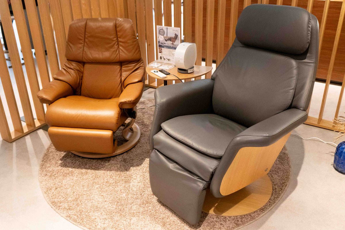 ストレスレス ソファは、アームレスト/シート幅/コーナーをカスタムできるステラシリーズから「ストレスレス ステラ1人掛け+ロングシート(Lサイズ)」を組み合わせている。また、ストレスレス チェアからはシグニチャーベースで、シンプルでモダンなデザインの「ストレスレス ビュー」を設置している。