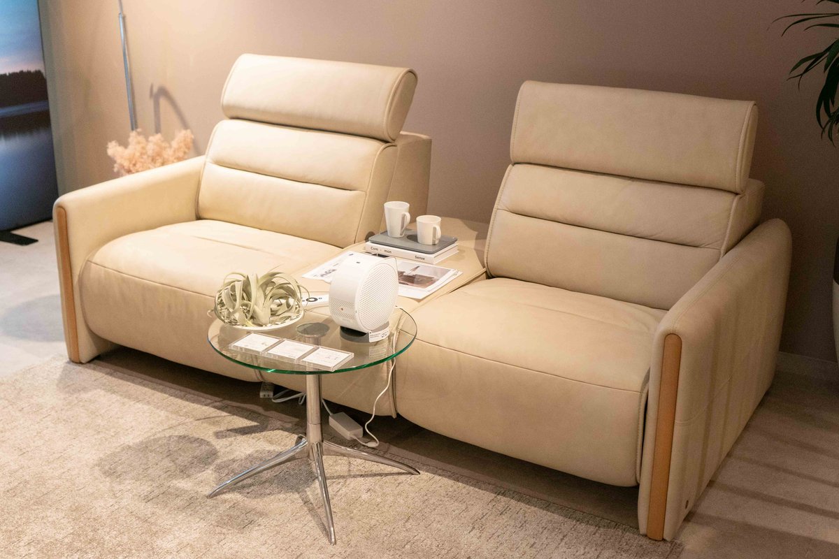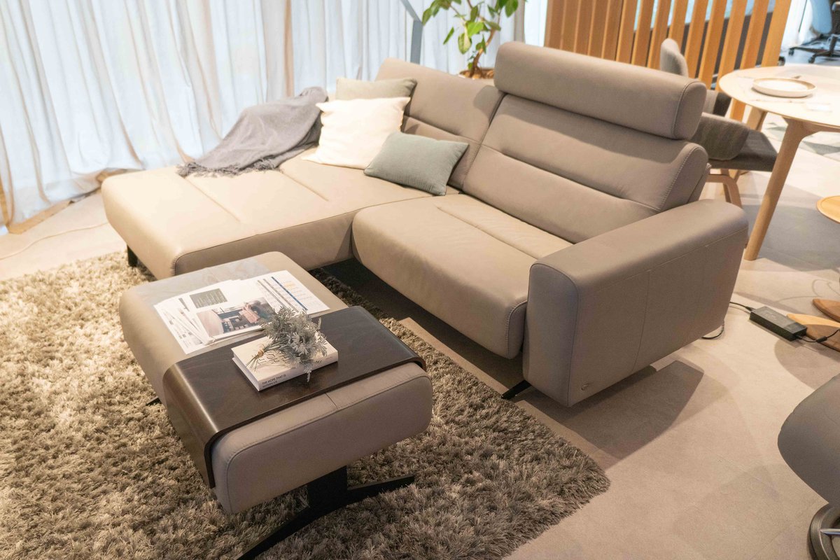 ストレスレス ソファは、こちらも電動モデルから優しいラインとモダンなデザインの「ストレスレス エミリー」、背面リクライニング連動のヘッドレストがボタン操作でスムーズに稼働。各シート間にセンターモジュールを入れることで、よりゆったりしたリラックス空間を演出している。幅広いカスタマイズに対応した「ストレスレス エミリー1 センター1」を組み合わせており、二人暮らしでのリラックス空間を体感できる。