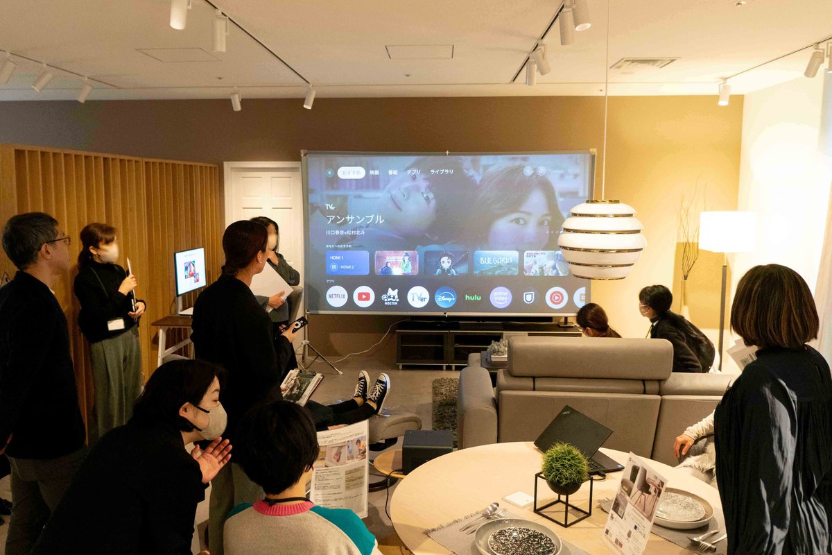「夫婦二人暮らしのリビングシーン」は、「天井モバイルプロジェクター GV50」が体験できるシーンとなっており、「天井モバイルプロジェクター GV50」のフレキシブルに動かせる角度調整機能を活かし、映像を天井に投影している。暖色ライトのリビングなどで使用しても、明るい映像を映すことができ、VODサービスによる映像コンテンツを視聴する、スマホの写真を映し出すといった楽しみ方も可能だ。