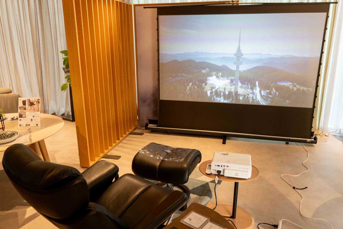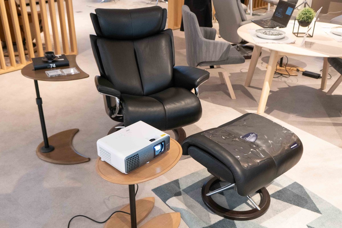 体験コーナーでは、エコーネスのストレスレスチェアとプロジェクター/Mac向けモニター/ゲーミングモニター/デザイナー向けモニター/スクリーンがマッチするインテリア空間を演出。今回、「夫婦二人暮らしのリビングシーン」「ファミリーのリビング&ダイニングシーン」「一人暮らしのシアターシーン」「一人暮らしのホームオフィスシーン」「二人暮らしのシアターシーン」といったシーン提案を実施した。