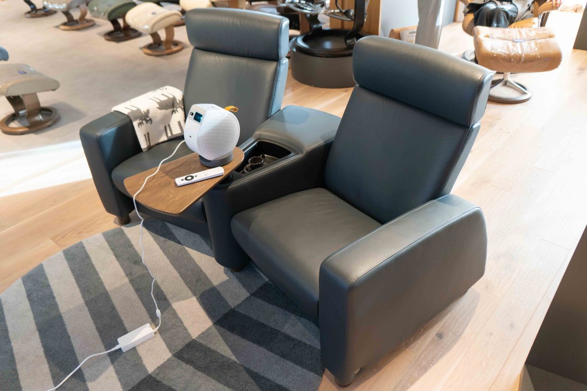 組み合わせるストレスレス チェアは、電動ハイエンドモデルである「ストレスレス サム ヒート&ウェーブ」と歴代ベストセラーモデルの電動タイプ「ストレスレス レノ パワー レッグ&バック」、ラグジュアリーなモデルを選んだ。ストレスレス サム ヒート&ウェーブは、ヘッドレスト/リクライニング/フットレストの電動3モーター駆動を導入しており、4レベルで調整できるヒーティング機能、2レベルの段階が選べるウェーブ機能を備えている。