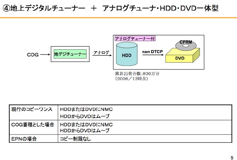 アナログチューナー搭載のHDD・DVDレコーダーの場合。コピーナインは中段の「COG蓄積とした場合」となり、現行のコピーワンスと変わらない