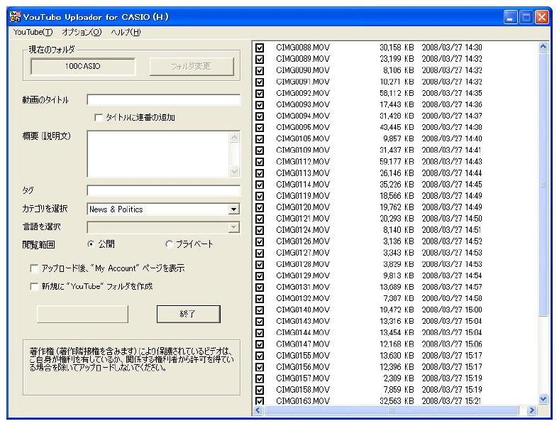 YouTubeUploaderを使うと、EX-F1のフラッシュメモリ上のデータをダイレクトにYouTubeにアップロードできる