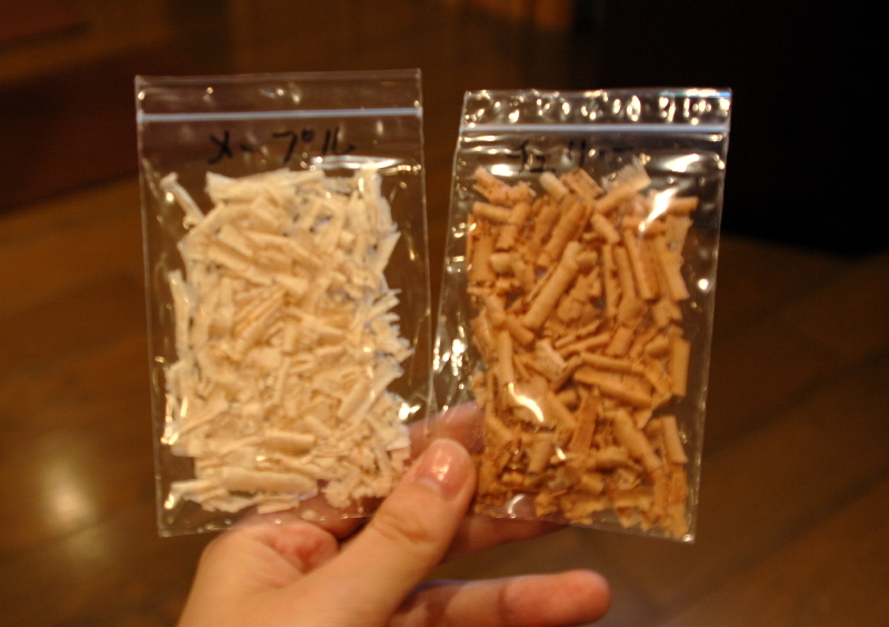 木製吸音素材はチェリー(右)から細かい孔が多いメイプル(左)に素材を変更