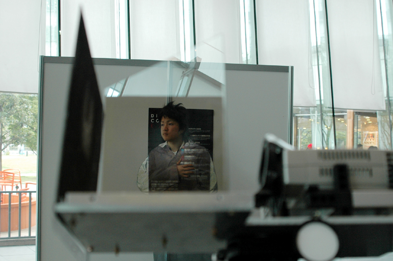 プロジェクターで投影した背景画像と、反射材から返ってくる光が両方見える場所では、このように「透けて」見える