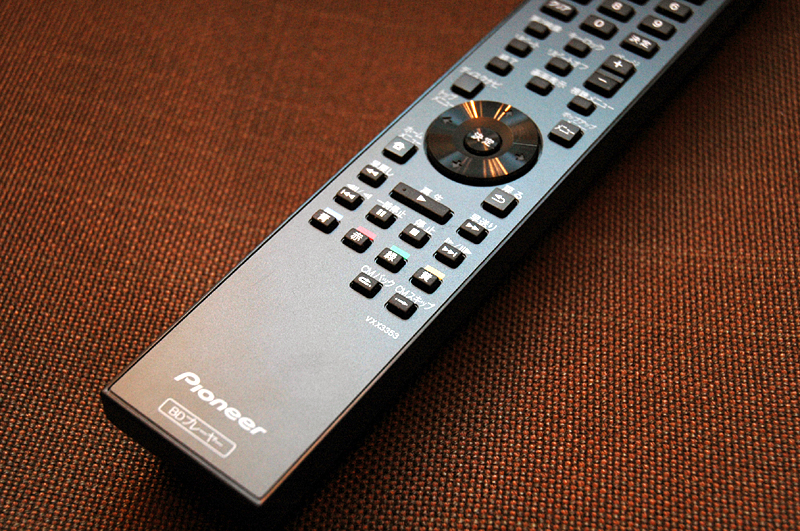 BDP-120のリモコン。ヘアライン仕上げはなく、「CMスキップ」「CMバック」用のボタンを備える