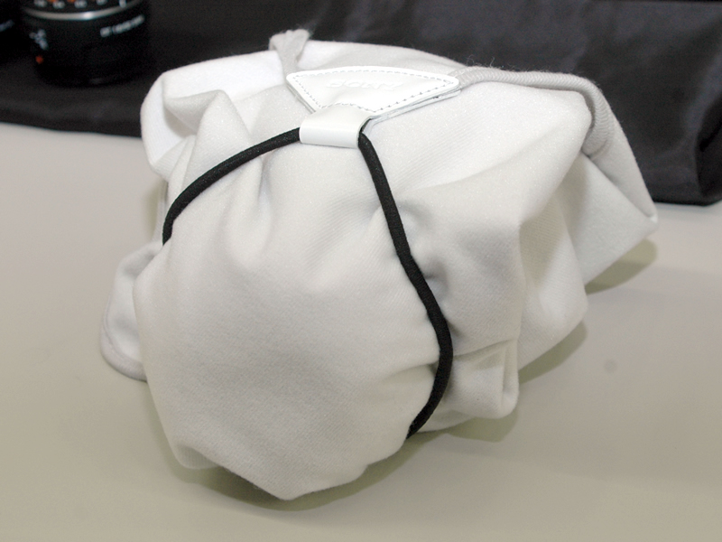 機体を包み、レンズ部にゴムを引っかけて使用。布が大きめなため、望遠レンズなどへ交換しても対応可能だ