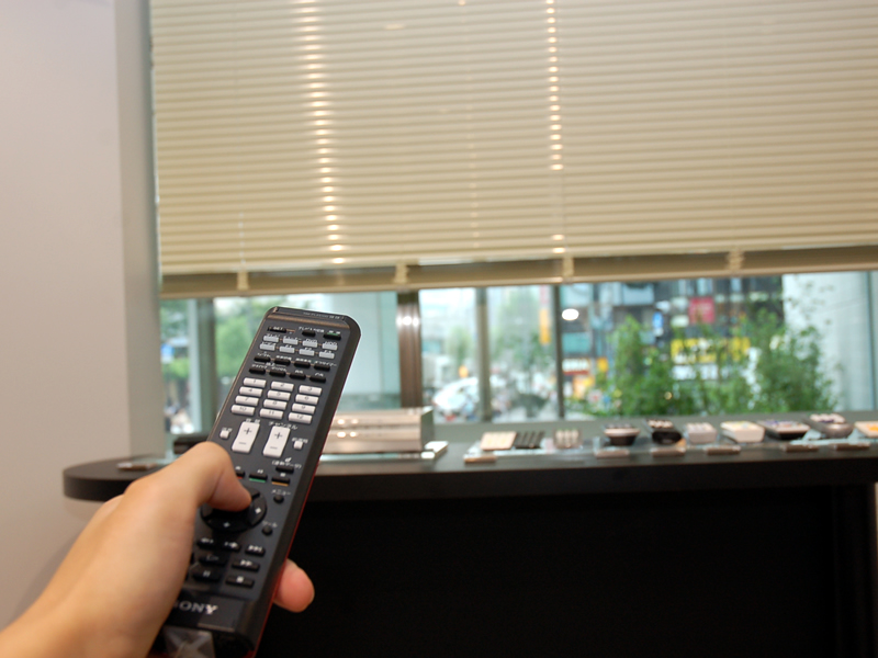 ブラインドを操作しているところ。ブラインドの上部に受光部が取り付けられている