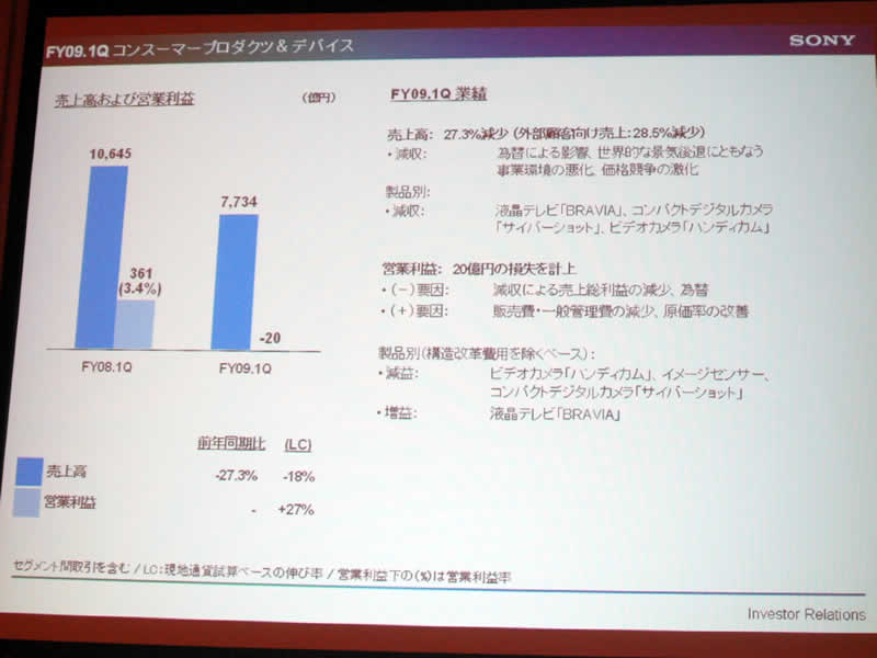 ソニー、09年1Q連結業績を発表 - 調整ベースでは233億円の営業利益