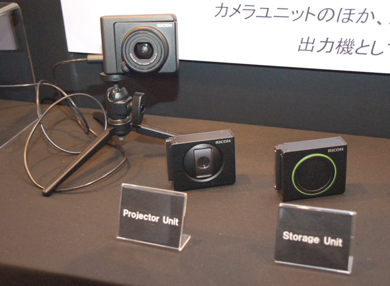 カメラユニットのプロトタイプを参考展示。「GPS」「プロジェクター」「ストレージ」の試作機