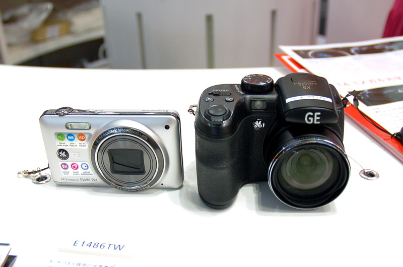 スリムデジカメ「E1486TW」とレンズ一体型デジタルカメラ「GE-X5」。GE-X15の小ささがよく分かる