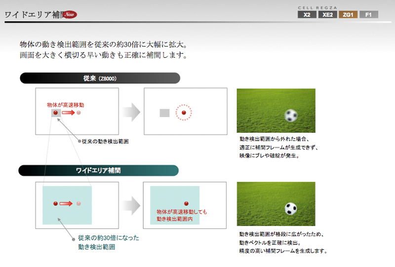 補間フレーム生成時は動き検出範囲が従来比約30倍に拡大された