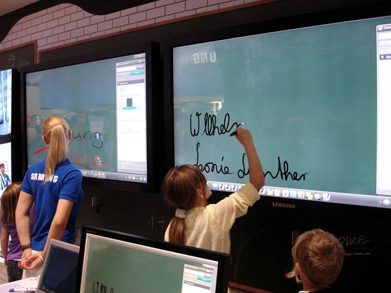 PDP及びLCDの大型ディスプレイを用いて、表面に直接書くことができる機能を積んだ「ホワイトボード機能」付きモニター。65型のLCDの場合は、タッチセンサーを用いつつ、強化ガラスで膜面を保護している。学校の授業などで使うことを想定している