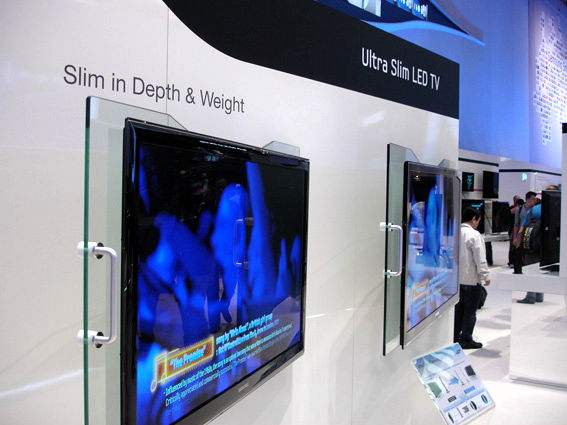 LEDが持つメリットとして超薄型が可能なこともしっかりアピール。従来方式と比べてLEDタイプの場合は体積を60%にすることができ、薄さもかつて50型で80mm程度だったものが、今や30mmを切る水準の薄さになったことを説明