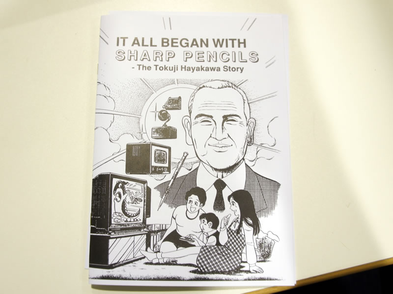 「IT ALL BEGAN WITH SHARP PENCILS」と題した、創業者の早川徳次氏の物語マンガもメディアに配布
