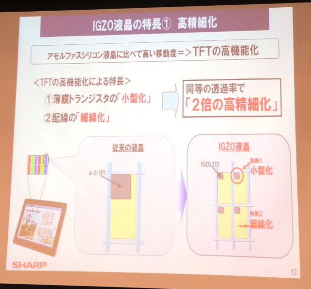 IGZOでは高精細化が可能。アモルファスシリコンに比べ、同等の透過率で2倍の高精細化が可能という