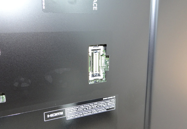 テレビの背面にはサービス端子を 用意。将来的なハードウェア/ソフトウェアのアップデートをスムーズに提供するためのもので「長くES8000シリーズを愛用してもらえるよう搭載した」(サムスンの展示説明員)という