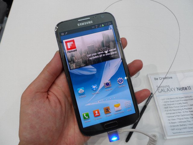 事前の噂通り発表となった「GALAXY Note II」のタッチ&トライには人だかりができていた。5.5型のSuper AMOLED搭載で1.6GHzのクアッドコアプロセッサ、OSはAndroid 4.1