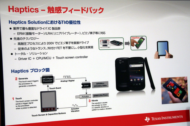 スマホの画面を触ると触感をフィードバックしてくれるシステムも。こちらは国内の主要スマホメーカーに既に採用されているとのこと