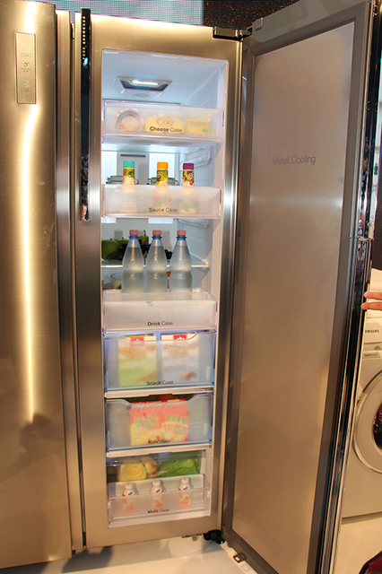 “ショーケース機能”付き冷蔵庫。ドアが2段階になっており、左写真のようにドアポケットに入れたものを簡単に確認・取り出しができる。右写真のように、普通に開くことも可能。