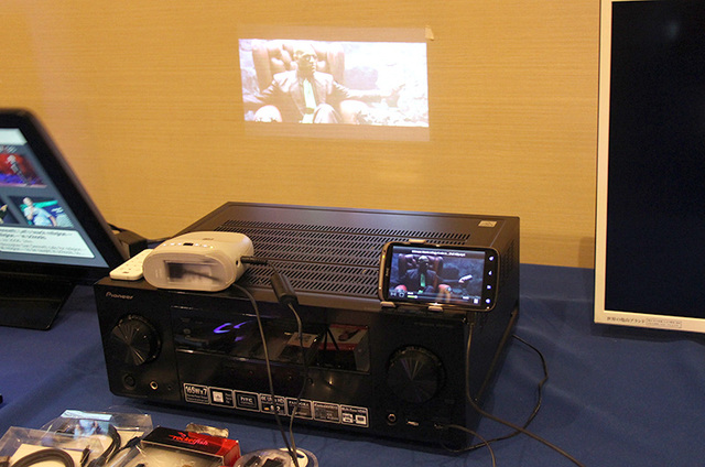 MHL対応AVアンプ(写真下)のアピールと、スマートフォンとMHL対応モバイルプロジェクターをつないだ投影のデモ