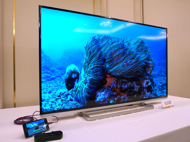 会場では各社がMHL対応製品をデモ(写真は東芝のREGZA 50G9)