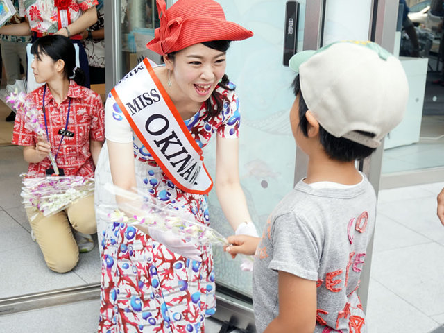 来場者にはミス沖縄クリーングレイシャスの名護さんから蘭の切り花のプレゼントも