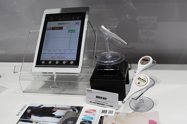 楽天とコラボした女性向けサービス「楽天キレイ℃ナビ」の紹介展示。東芝製体温計から基礎体温をワイヤレスでスマホに飛ばし、体のリズムを把握・予測しやすくするサービス。