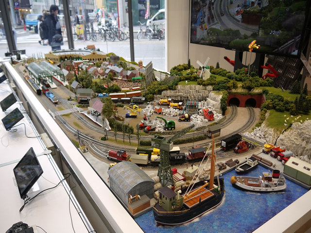 「きかんしゃトーマス」のジオラマでは、動く機関車模型を対象に動体撮影を体験できる。ジオラマの周囲に設置されたさまざまな機種もそれぞれ使用可能