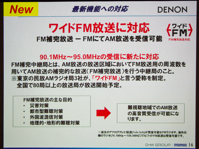 FMにてAM放送を受信可能なFM補完放送「ワイドFM放送」に対応したFM/AMラジオチューナーを搭載