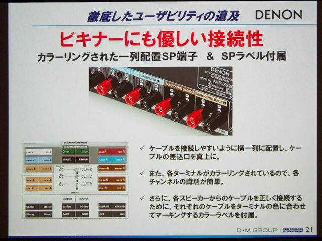 横一列配置+色分けされたスピーカー端子により接続性も向上