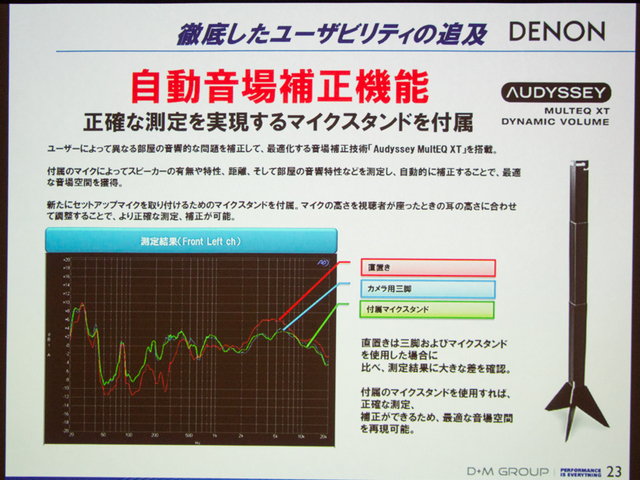 下記の測定結果のグラフは、測定マイクを椅子などに直接置いた場合に比べて、付属のマイクスタンドを使うことでより正確な測定・補正が行えることを示している