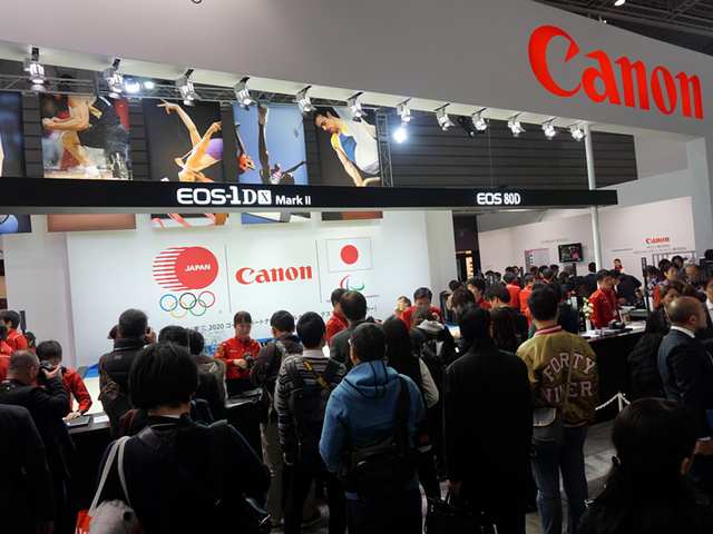 キヤノンブースは初日の午前中から体験コーナーに人だかりが