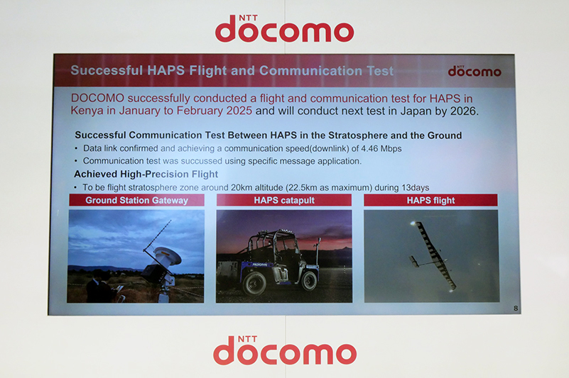 そして実際、今回のMWC Barcelonaに合わせてNTTドコモはHAPSの具体的な成果も披露。日本電信電話(NTT)とスカパーJSATとの合弁で宇宙事業を手がけるSpace Compassと、ケニア共和国で高度約20kmの成層圏を飛行するHAPSを介し、地上のスマートフォンとLTEによるデータ通信の実証実験に成功したことを2025年3月3日に明らかにしている。